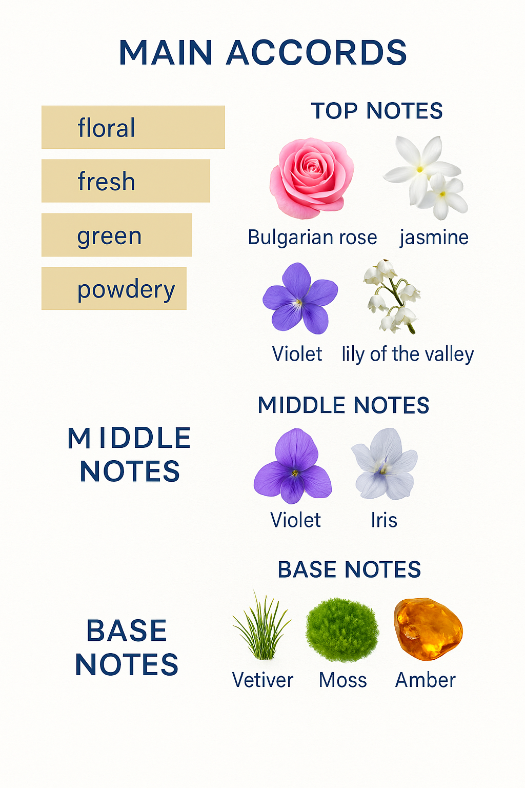 Fragrance notes include: Bulgarian rose, jasmine, lily of the valley, violet, iris, vetiver, moss, and amber.
