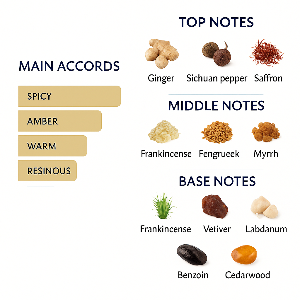 The base notes consist of frankincense, myrrh, vetiver, labdanum, benzoin and patchouli.