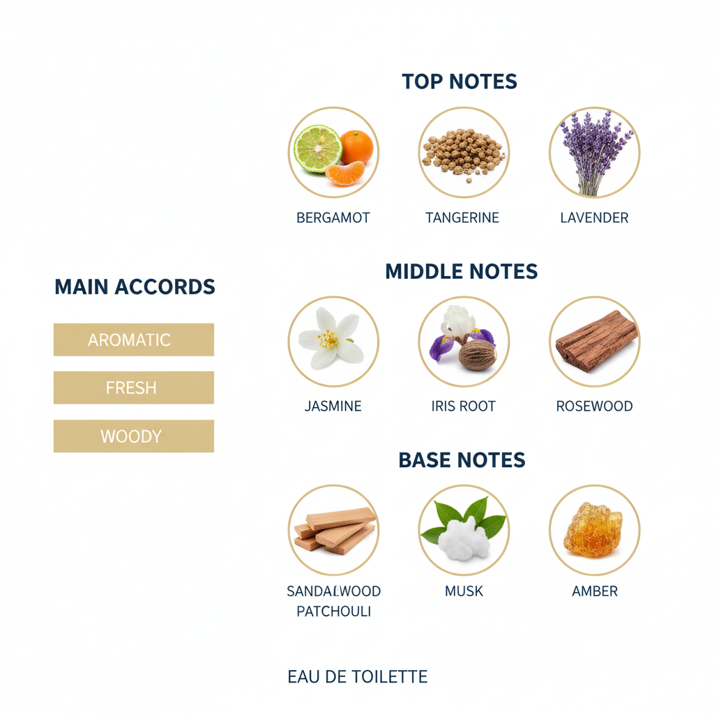 Base Notes: Sandalwood, patchouli, musk, amber – elegant and long-lasting