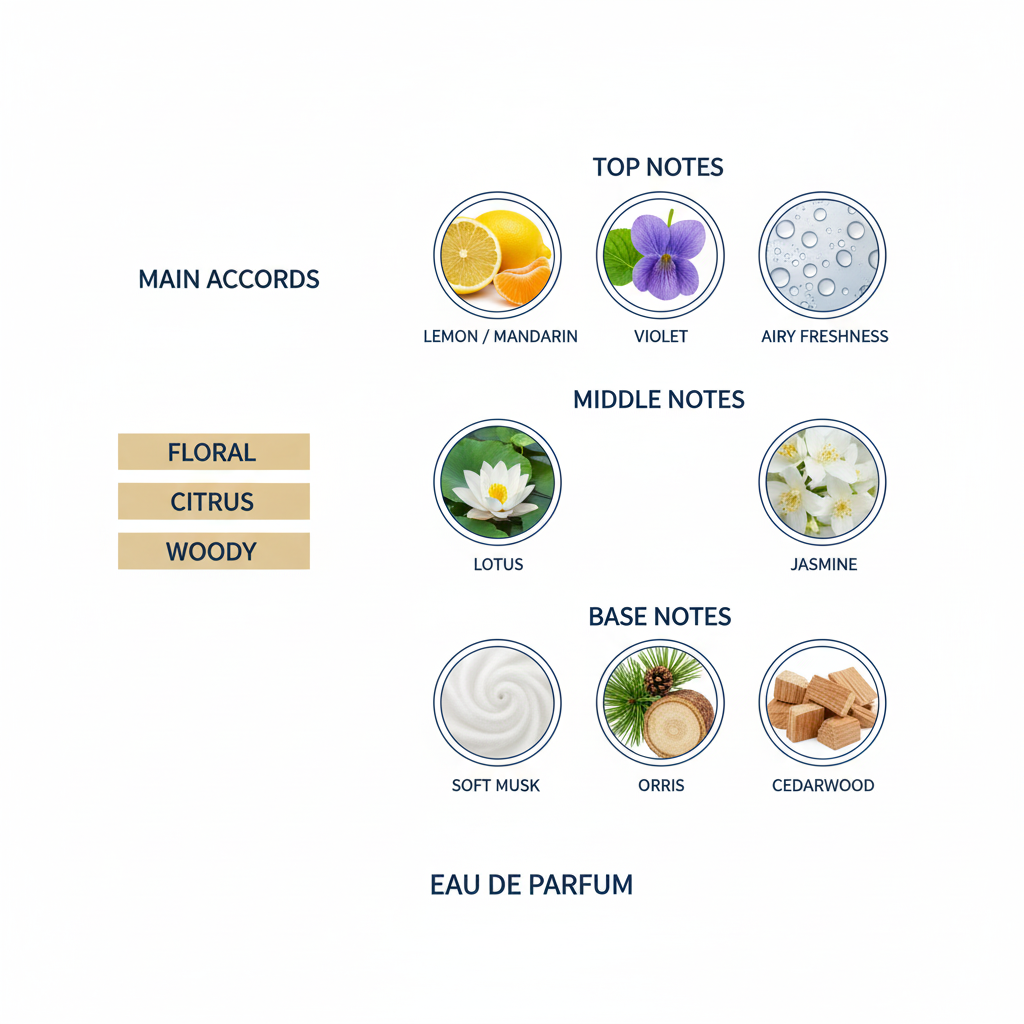 The scent opens with refreshing notes of lemon, a splash of mandarin, and a hint of violet, creating an airy freshness like the smell of clean air after a thunderstorm.