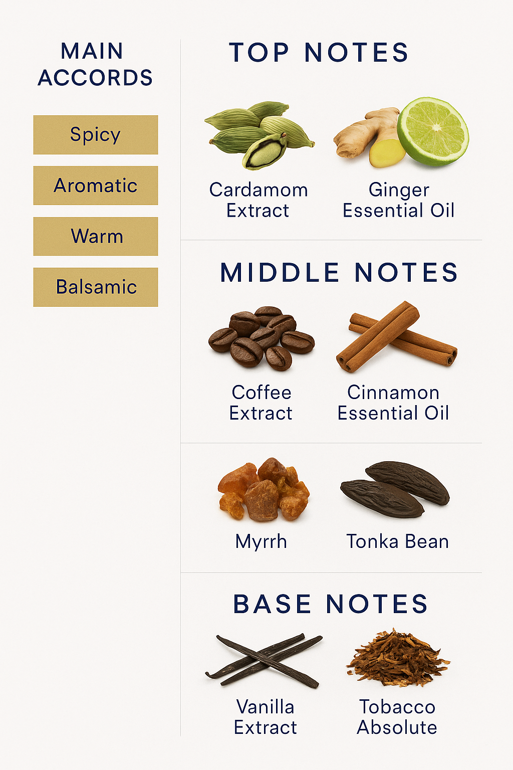 Heart notes: coffee extract, cinnamon essential oil, myrrh