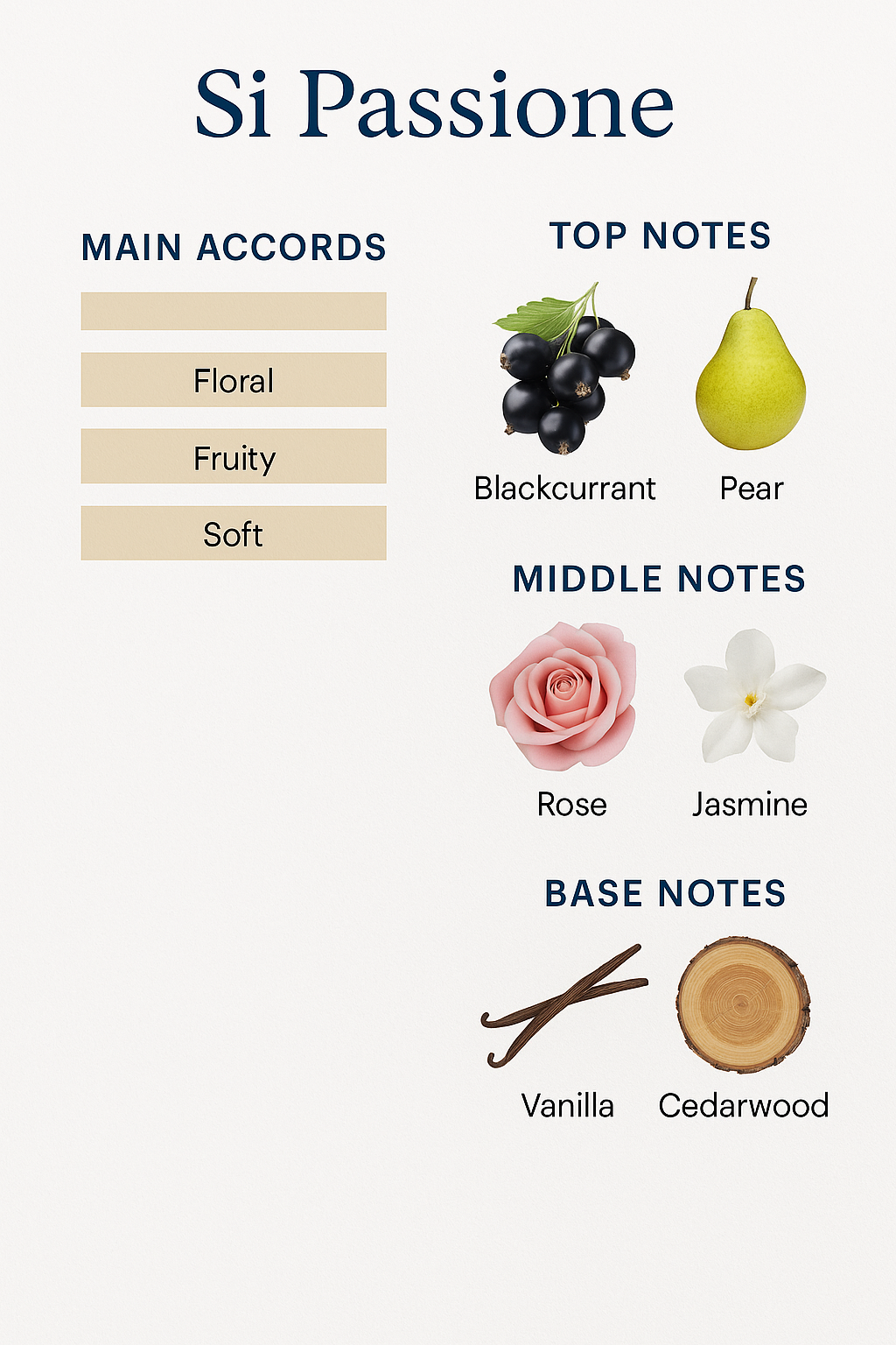 Si Passione is a woody floral perfume that carries beauty and femininity.