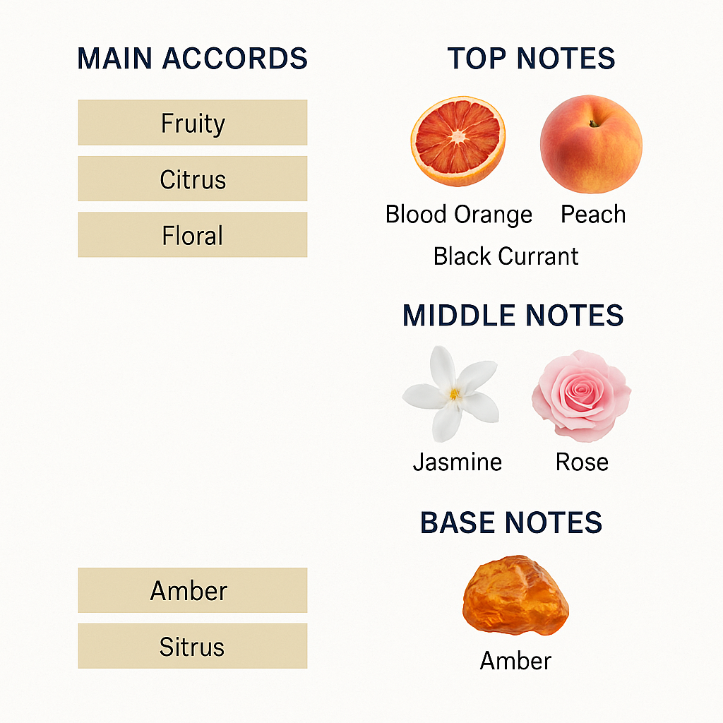 Top notes: blood orange, peach, black currant.