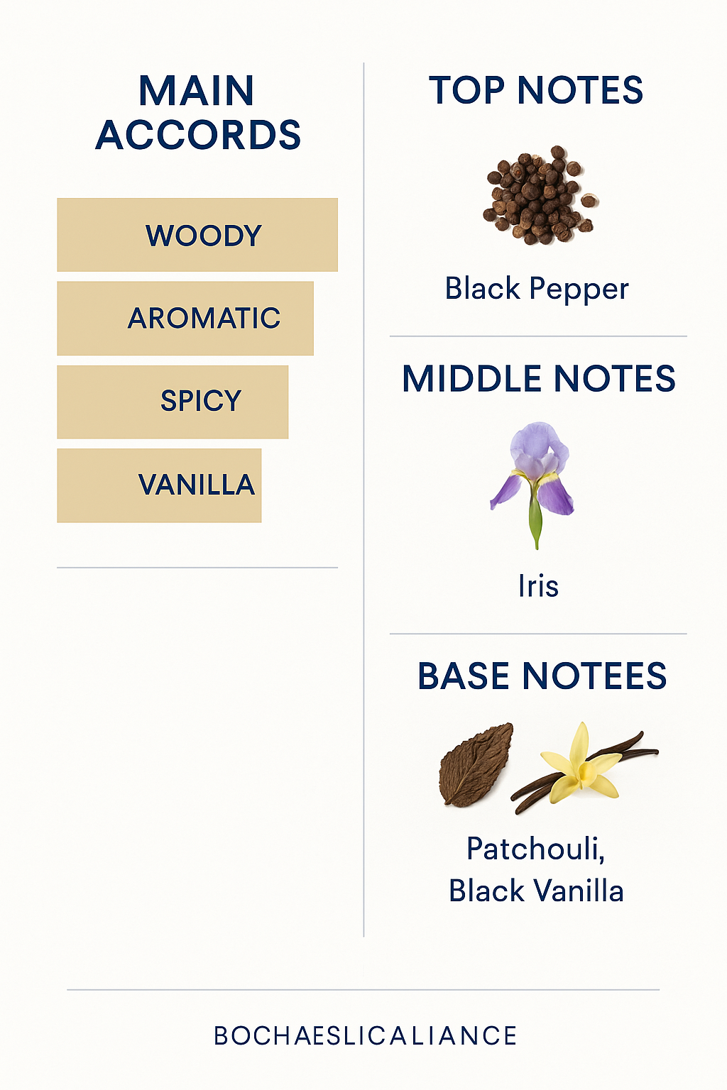 The fragrance shines with a distinctive and sensual bouquet that opens with a spicy top note of black pepper, followed by a floral heart with iris.