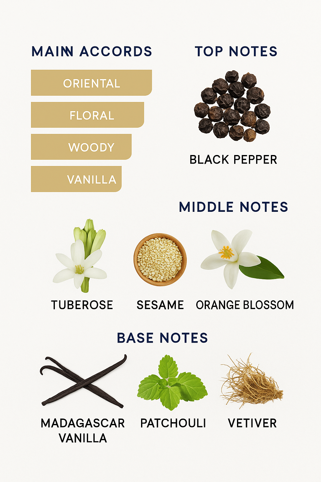 Base notes: Madagascar vanilla, patchouli, and vetiver.