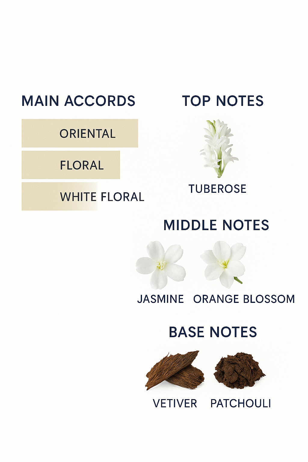 It is a fragrance built on the contrast between a bouquet of white flowers, mainly tuberose, and strong woods and earthy notes.