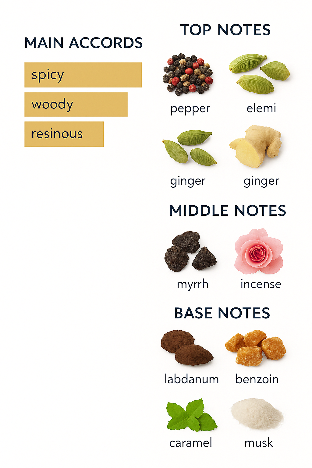 Top notes are pepper, elemi, cardamom and ginger; middle notes are myrrh, incense, rose and mimosa; base notes are cedarwood, labdanum, benzoin and patchouli.