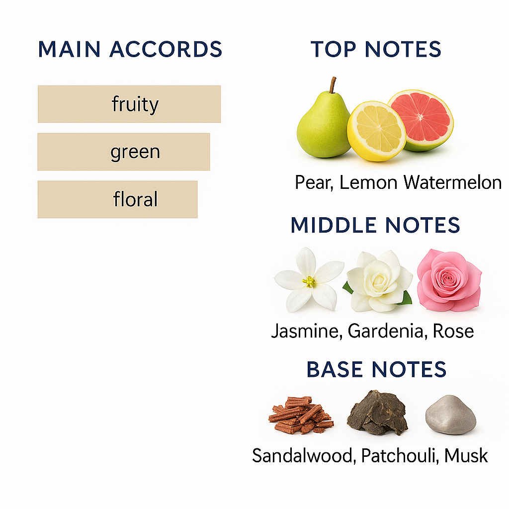 Opening: Refreshing fruity notes of pear, lemon and watermelon give a feeling of freshness and vitality.