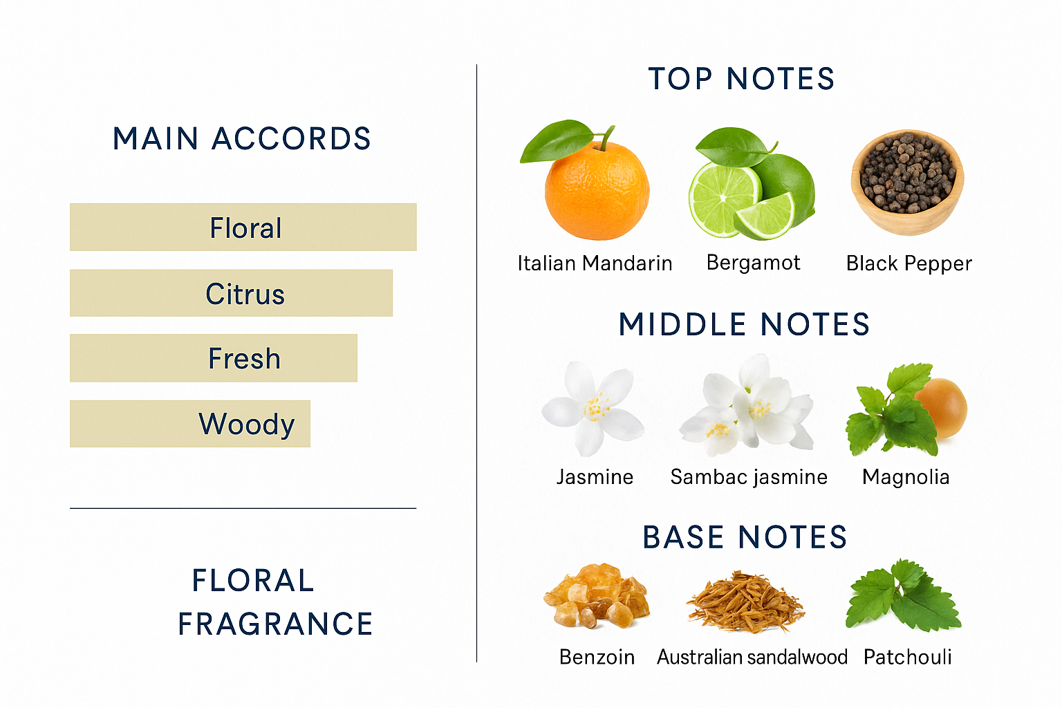 The fragrance embodies the beauty of the jasmine flower through delicate and powerful floral notes.