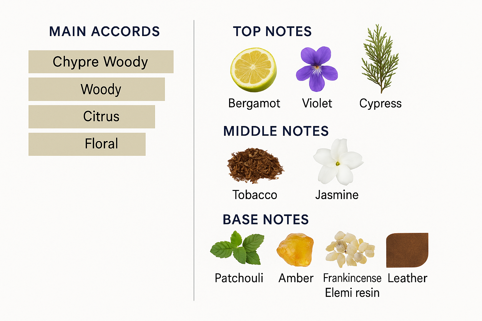 The aromatic base concludes the composition with patchouli, amber, frankincense, elemi resin and leather.