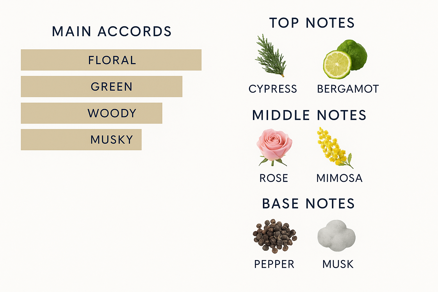 Ingredients: cypress, bergamot, rose, mimosa, pepper, and musk