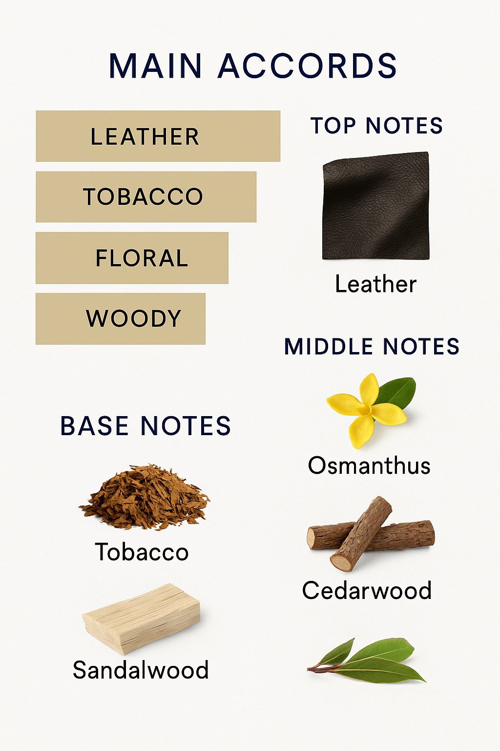 Leather, Tobacco, Osmanthus, Sandalwood, Cedarwood