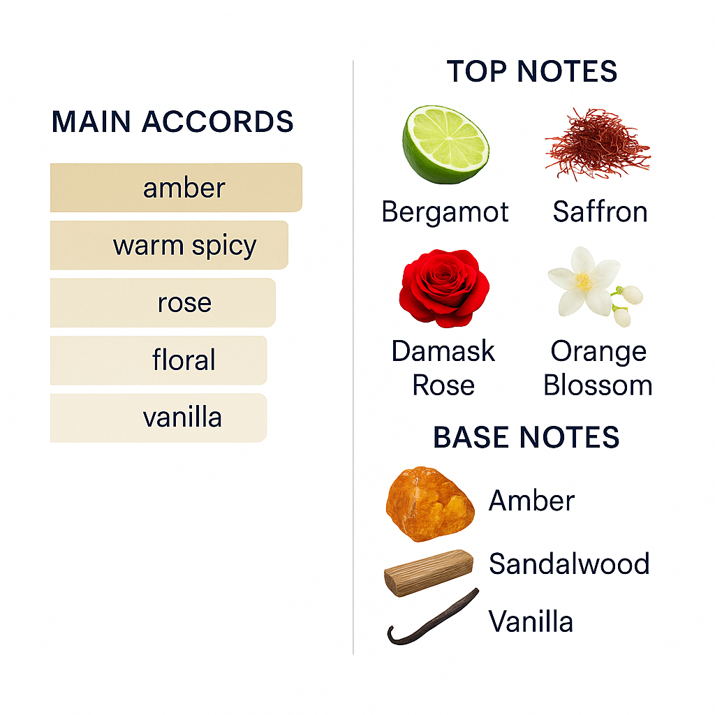 Introduction: Top notes of bergamot, saffron, and pink pepper give a fresh and energetic start.