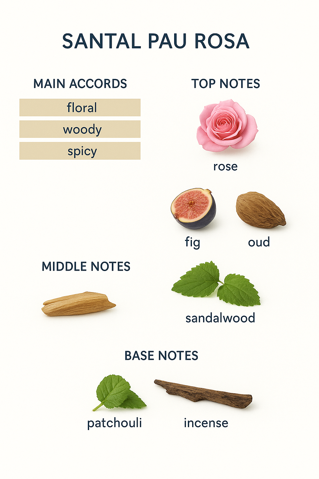 This fragrance features a beautiful and balanced blend of sandalwood, rose, cardamom, fig, oud, patchouli and incense.