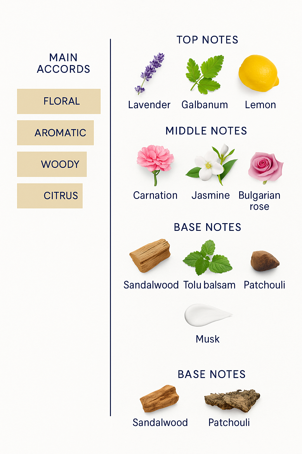 Base notes: sandalwood, tolu balsam, patchouli, musk, oak moss