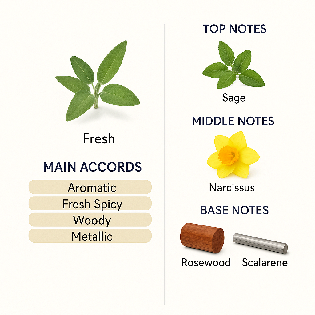 A mix of sage, narcissus, fresh rosewood, and a warm metallic note of sclarene.