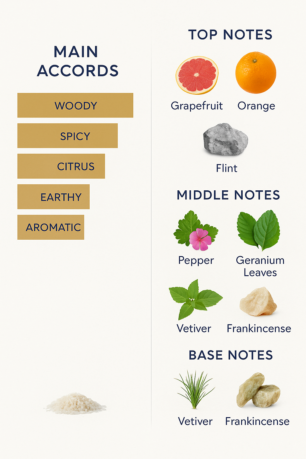 A woody spicy fragrance for men. Launched in 2006. A mineral-plant fragrance that combines heaven and earth. It combines citrus scents with mineral components of flint, plants, and spices. Designed for the simple, complex, sensitive, and decisive man.