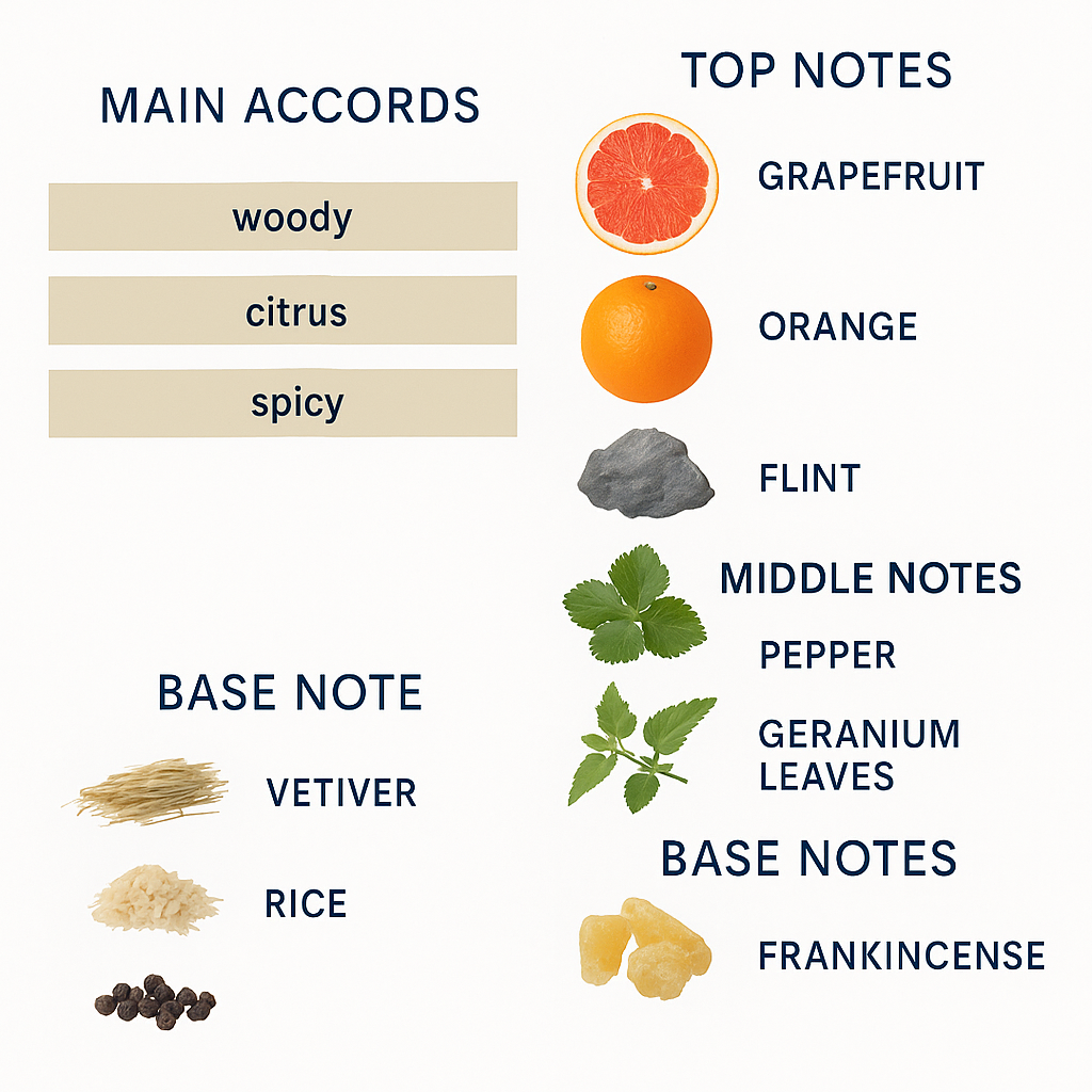 A woody spicy fragrance for men. Launched in 2006. A mineral-plant fragrance that combines heaven and earth. It combines citrus scents with mineral components of flint, plants, and spices. Designed for the simple, complex, sensitive, and decisive man.