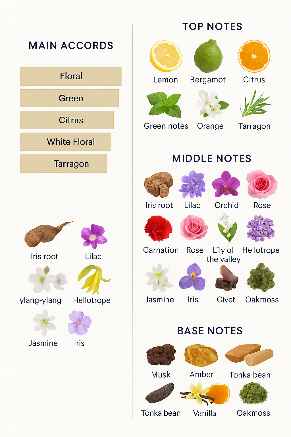 The fragrance composition carries a lasting freshness, beginning with a sparkling top that features lemon, bergamot, citrus, green notes, orange blossom, and tarragon.