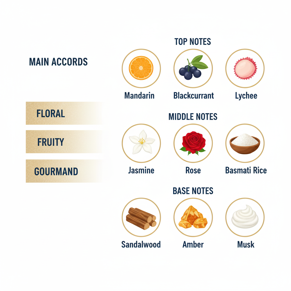 It opens with mandarin, blackcurrant (cassis), and lychee, followed by a floral heart of jasmine, rose, and basmati rice, all wrapped in a warm, sensual base of sandalwood, amber, and musk.