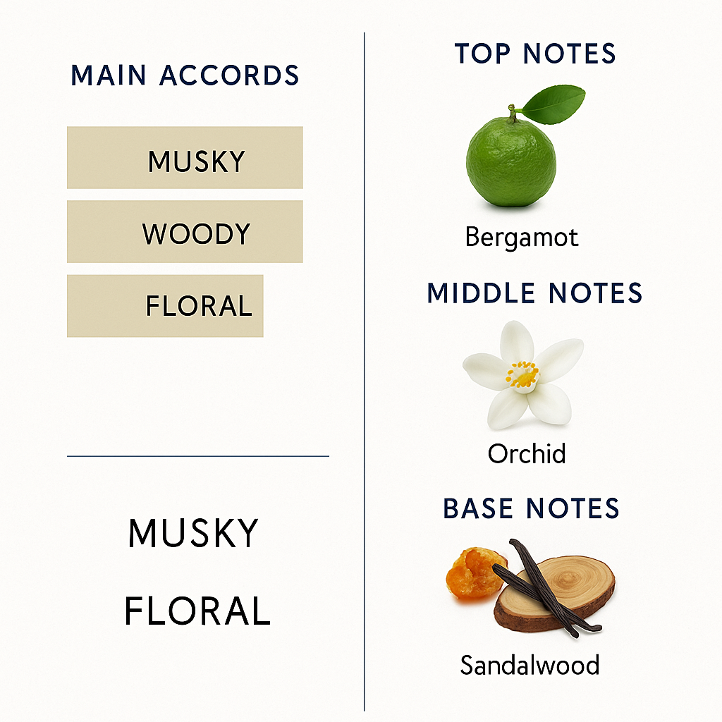 This luxurious fragrance flows with a rich composition of musk, sandalwood, vanilla, and orchid flowers, resulting in a warm, captivating scent that lingers all day.