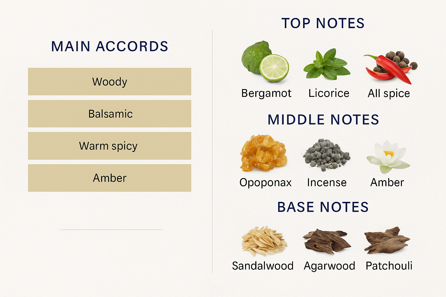 This warm, deep, and refined blend evokes a sense of elegance and individuality. A remarkable scent from the woody fragrance family, it features a bold, mysterious aroma that enhances your presence with distinction and sophistication.