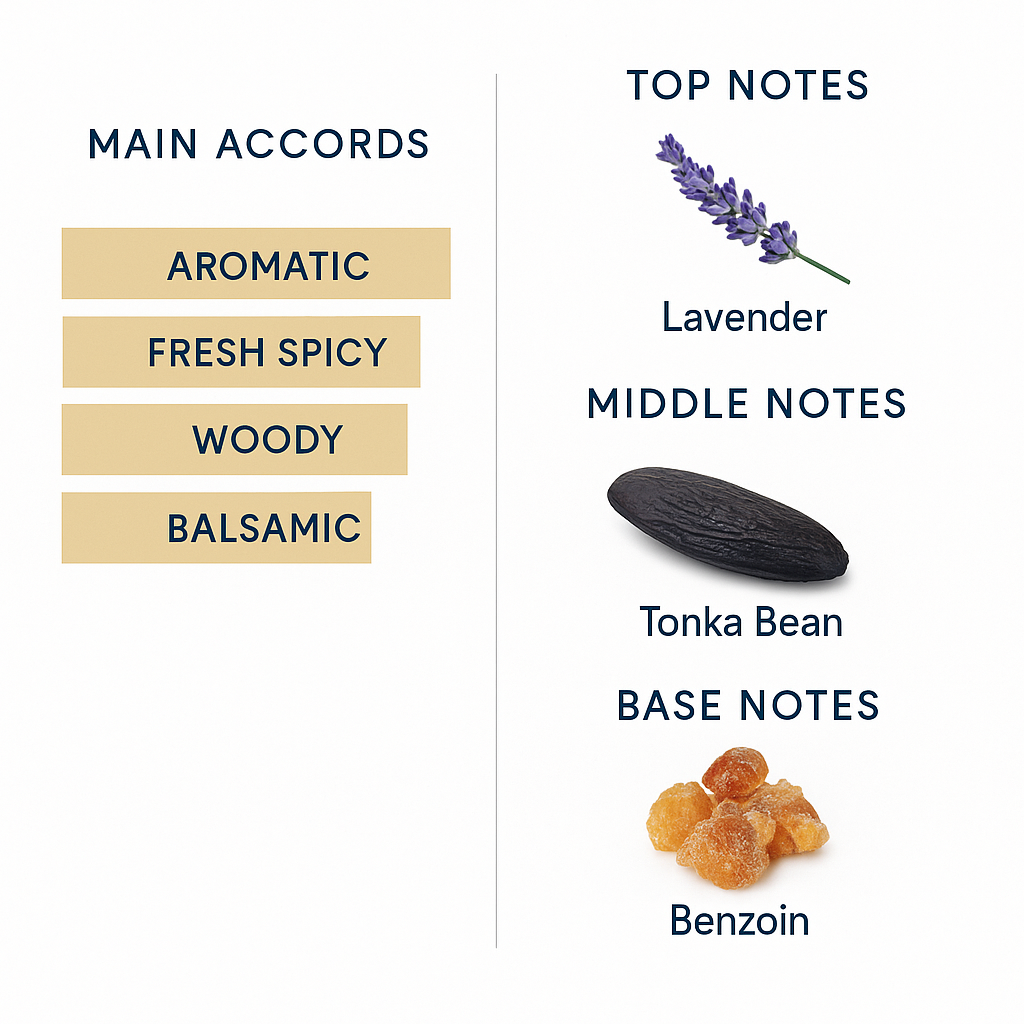 Waves of cool breeze catch your breath and take over your soul to fill it with vitality. A fragrance that glows like drops of gold, exuding the scent of lavender and velvety tonka to give you absolute attraction. A touch of warm benzoin at the end of the fragrance symbolizes luxury and increases the strength of the scent to maintain your special charm for the man with a strong personality and high influence, making him feel like he is the captain of the ship and takes on the task of leadership.