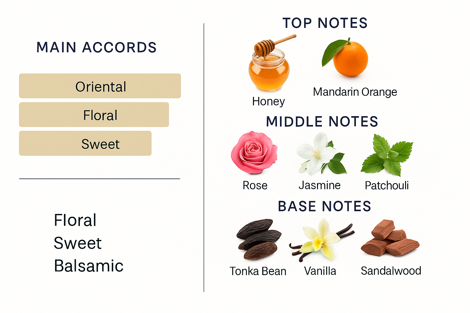 Top notes: Honey orange and mandarin orange give the fragrance a fresh and vibrant scent.