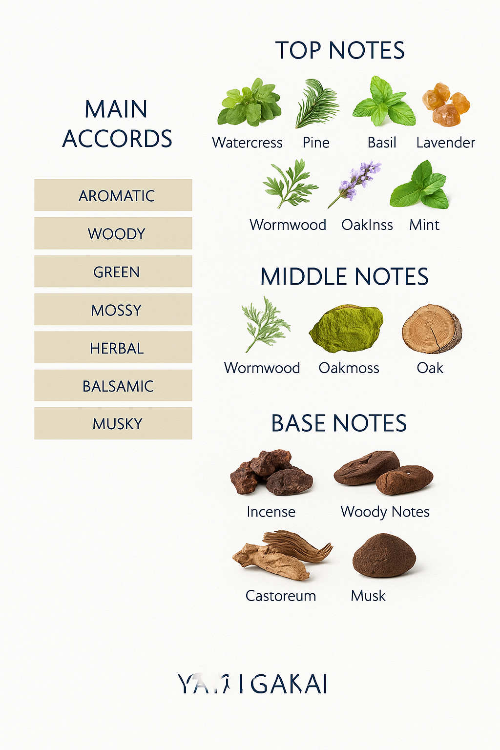 Aromatic middle notes of wormwood, oakmoss and oak, aromatic base notes of incense, woody notes, castor oil and musk.