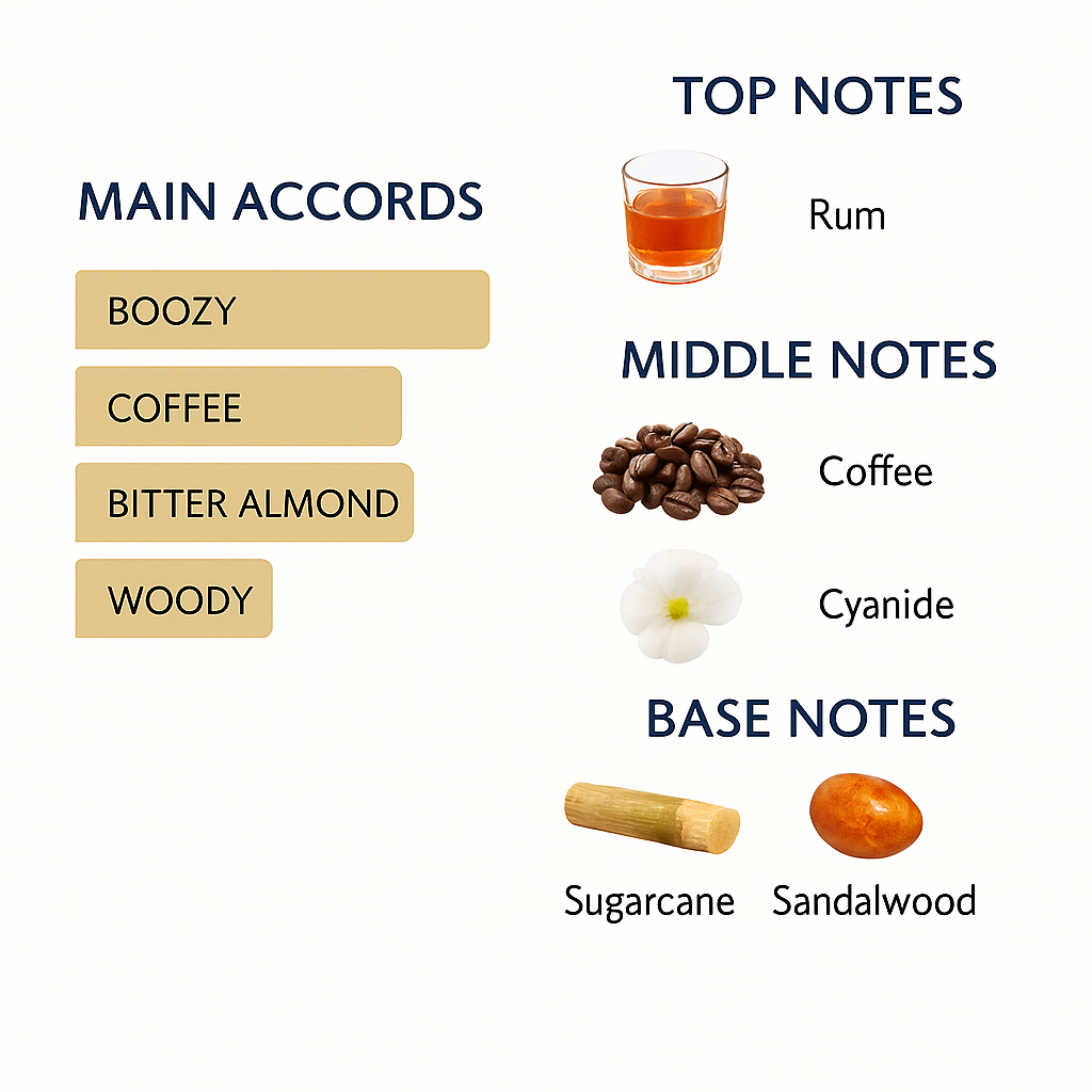 The rum scent from Martinique, reminiscent of Pirate Water, brings out the strong coffee aroma in the heart notes, balanced with vetiver essence.