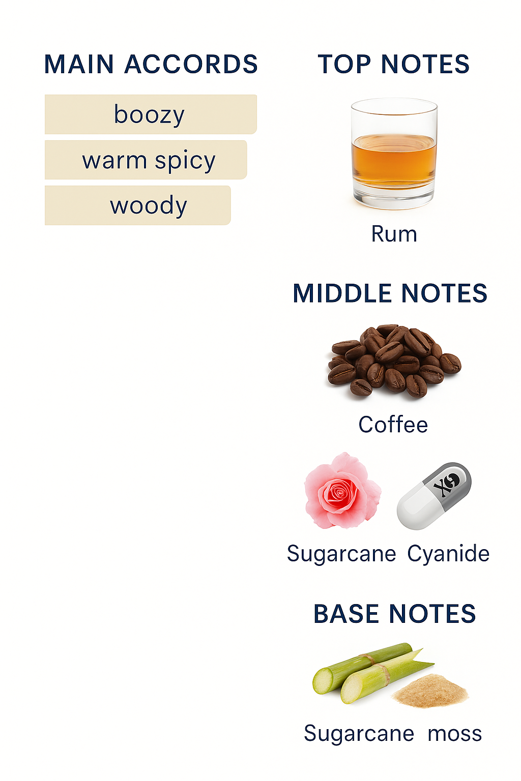 The rum scent from Martinique, reminiscent of Pirate Water, brings out the strong coffee aroma in the heart notes, balanced with vetiver essence.