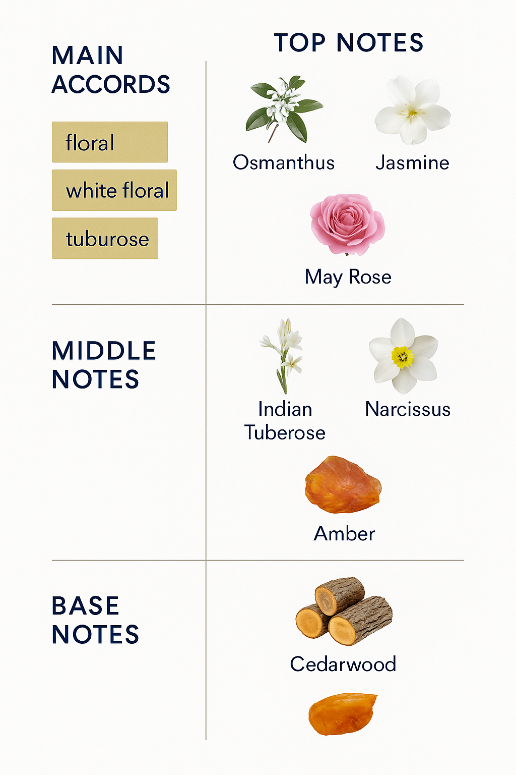 Middle notes The heart is centered around the scent of Indian tuberose and narcissus, adding a warm and charming touch.
