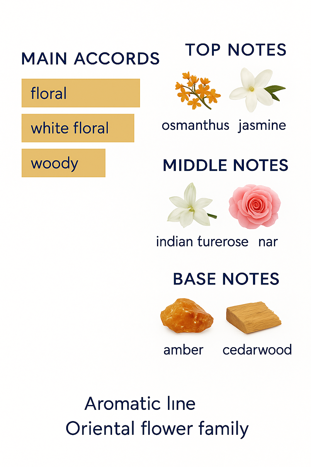 - *Middle notes:* The heart is centered around the scent of Indian tuberose and narcissus, adding a warm and charming touch.
