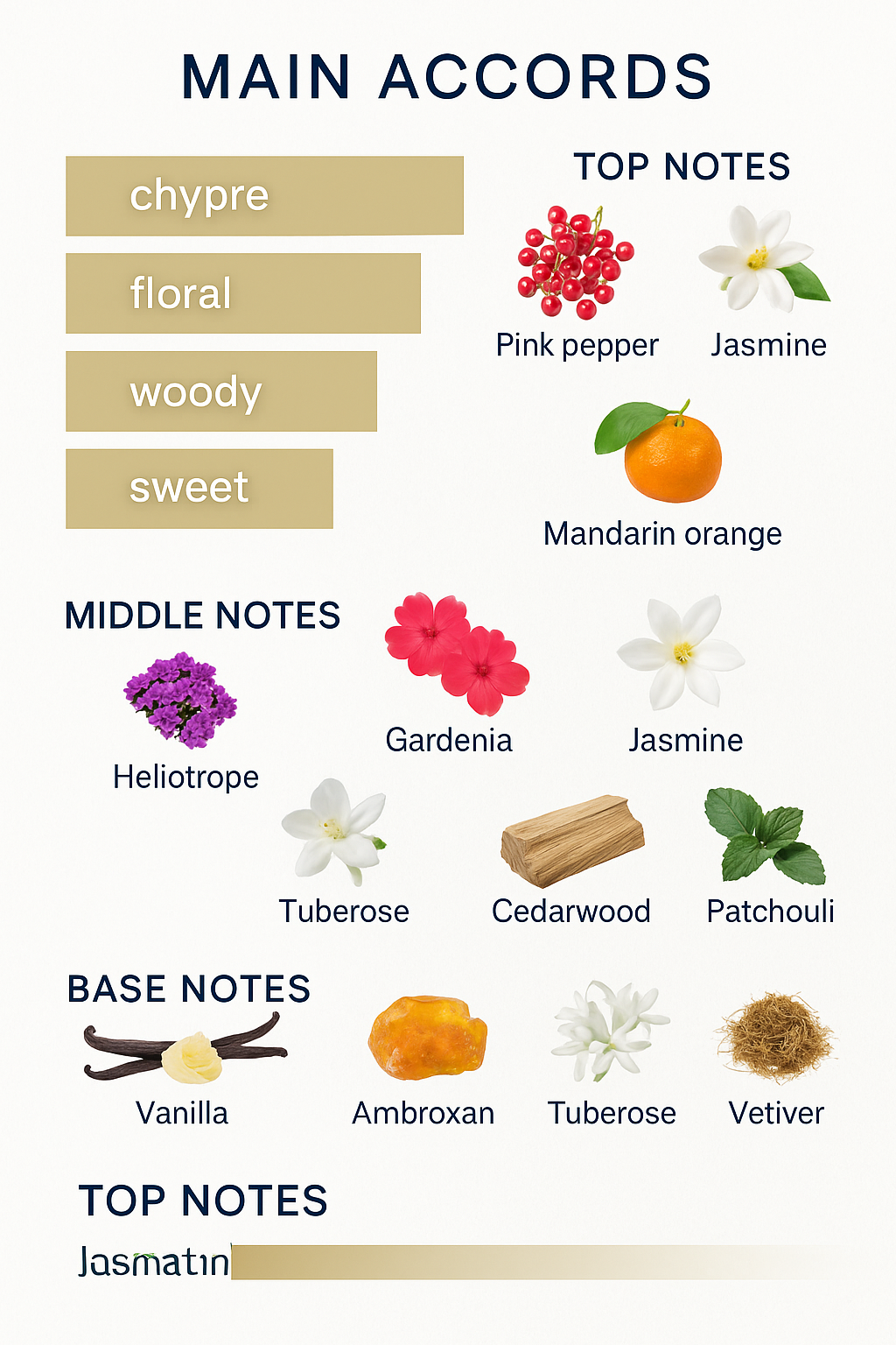 Heart of the fragrance: The fragrance then moves to a rich floral heart that combines gardenia, heliotrope, and jasmine, giving the fragrance a touch of elegance and attractiveness.