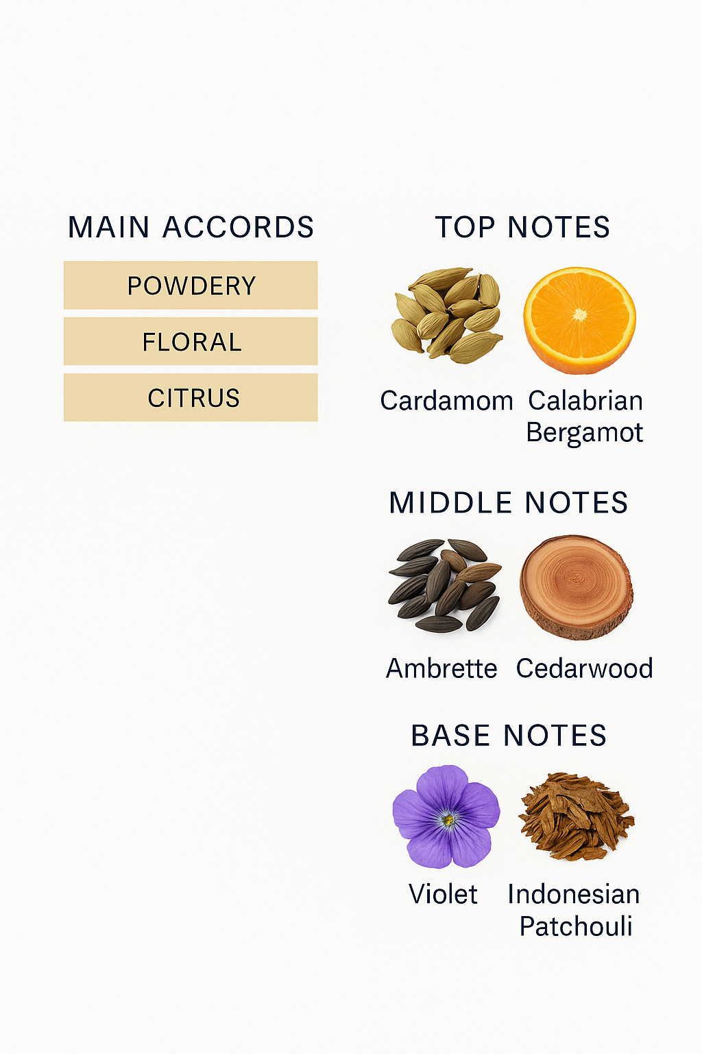 Heart notes: ambrette, cedarwood, sandalwood, seeds