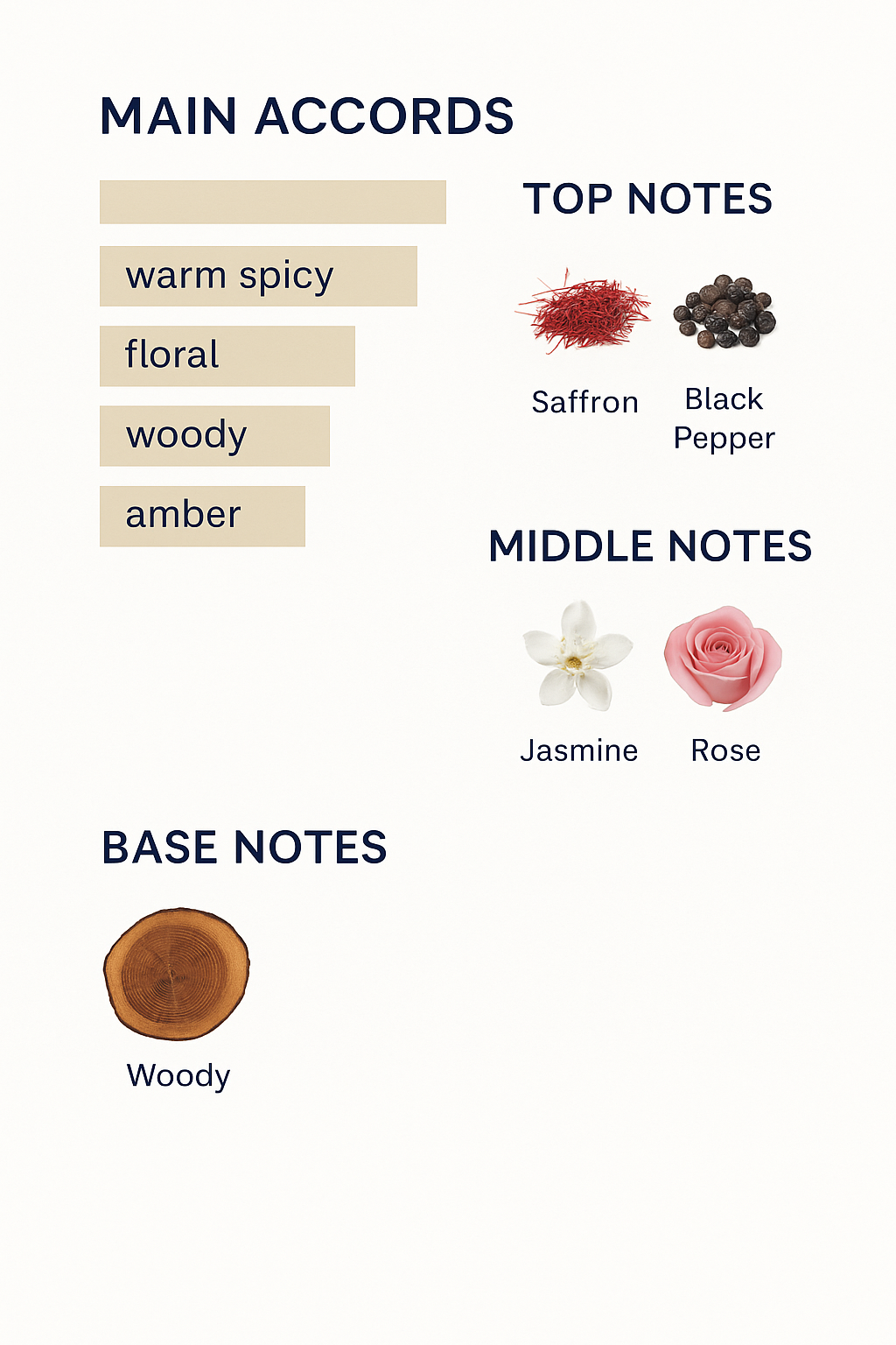 Oriental Spice Blend: The fragrance opens with strong notes of saffron and black pepper, followed by a floral heart of jasmine and rose, and the base settles on a warm woody base of