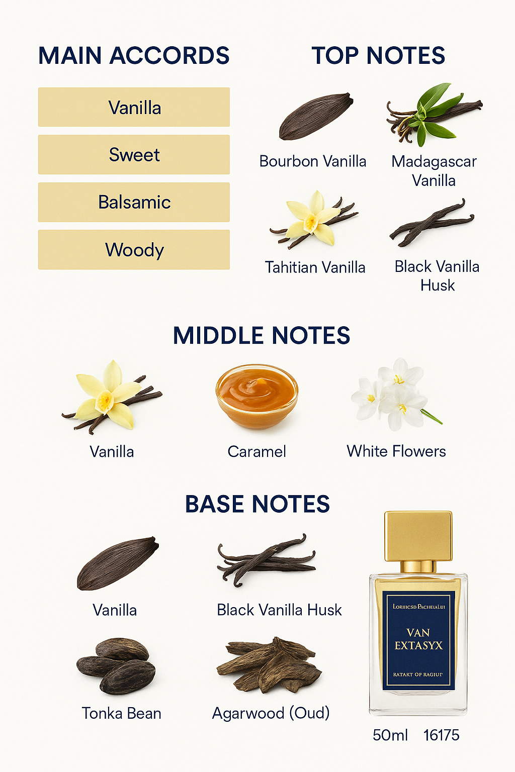 Top notes are Bourbon vanilla, Madagascar vanilla, Tahitian vanilla and black vanilla husk;