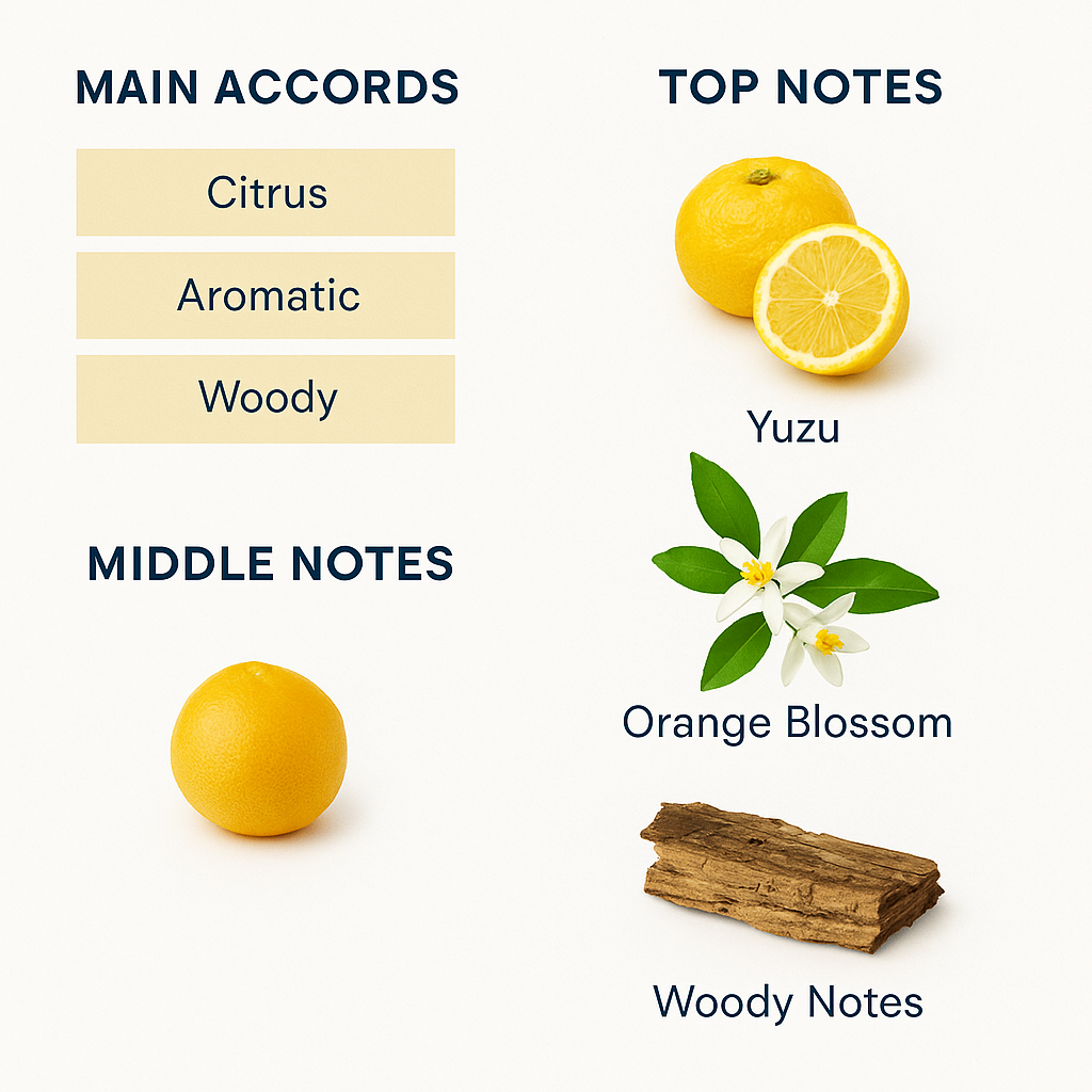 The fragrance opens with bright notes of Japanese yuzu, a citrus fruit with a fresh and vibrant scent.