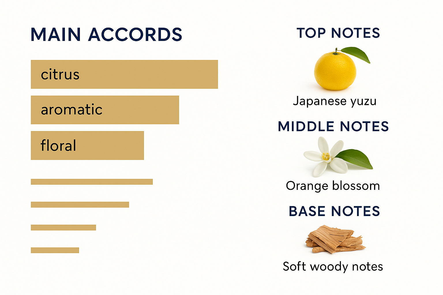 The fragrance opens with bright notes of Japanese yuzu, a citrus fruit with a fresh and vibrant scent.