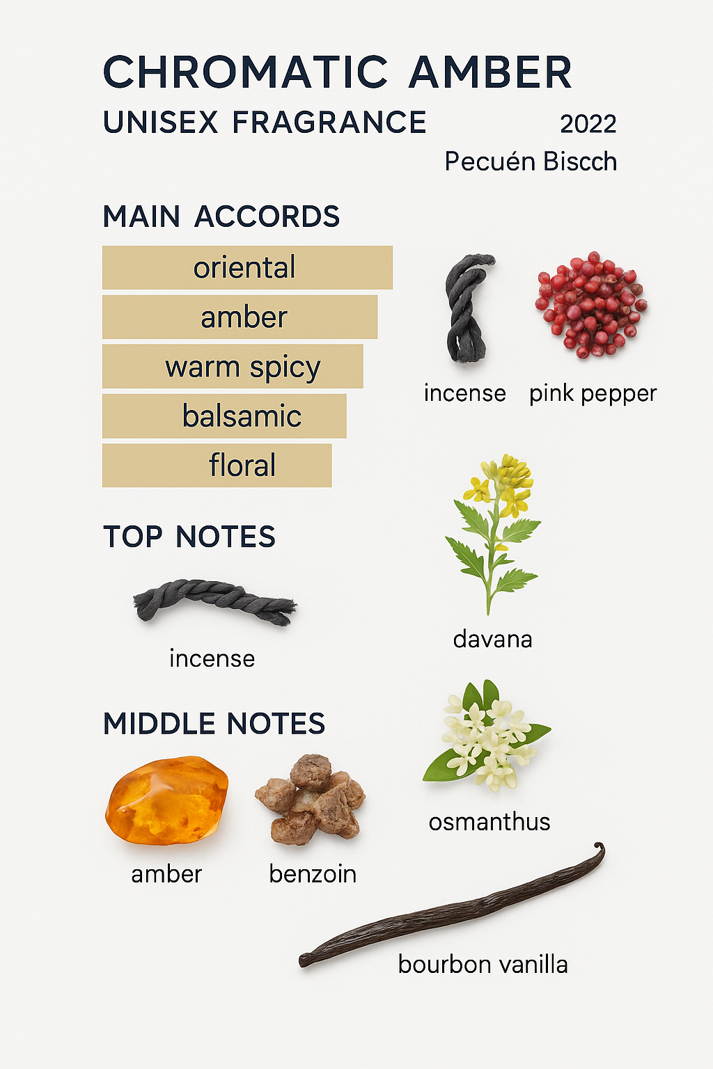 Top notes are incense and pink pepper; middle notes are davana and osmanthus; base notes are amber, benzoin and bourbon vanilla.