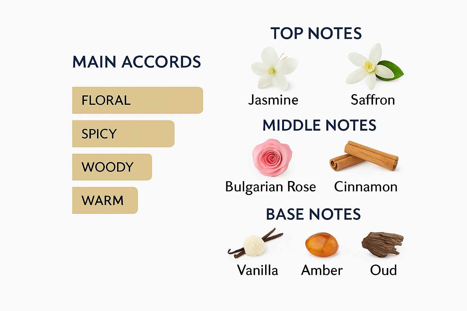 Top Notes: The fragrance opens with enchanting notes of jasmine and saffron, blended with refreshing notes of cinnamon, creating a unique and attractive blend.