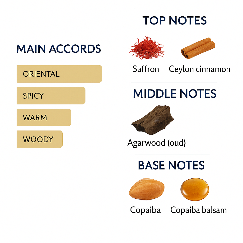 Fragrance notes: Saffron, Ceylon cinnamon, agarwood (oud) and Copahu balsam.