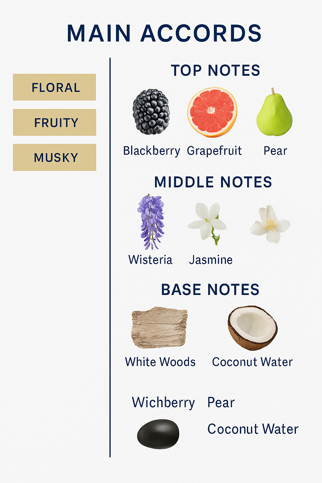 Top notes: Blackberry, pear, and grapefruit, adding a touch of freshness and vitality to the fragrance.