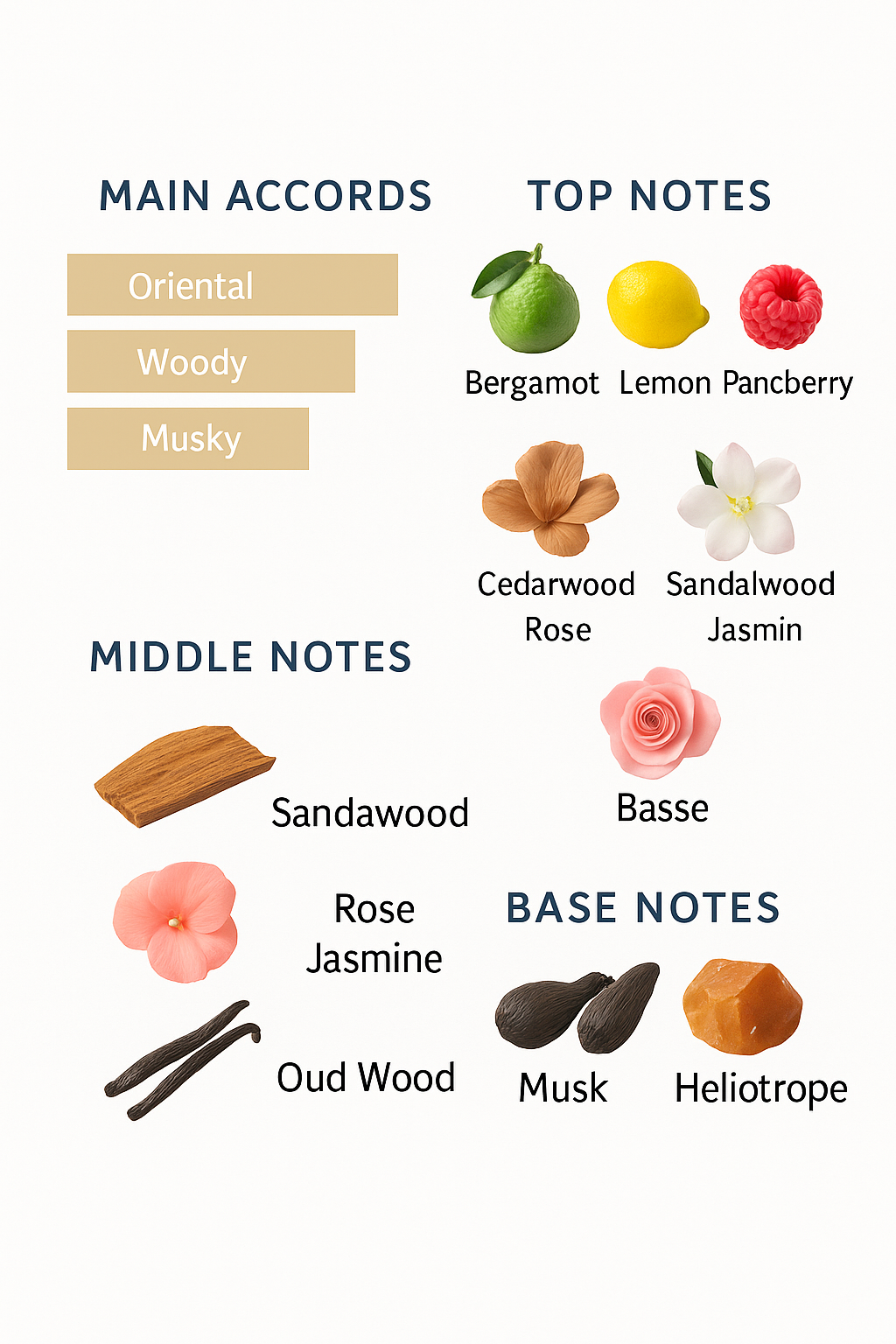 Middle notes: cedarwood, sandalwood, rose, jasmine