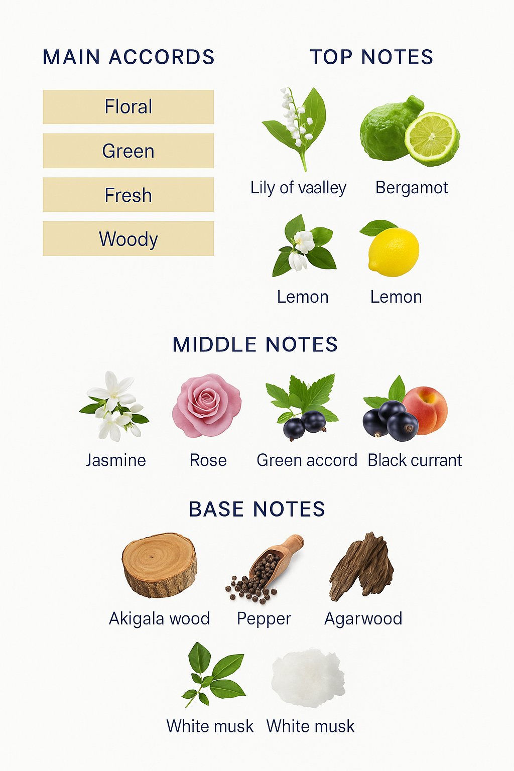 Top notes: The fragrance opens with a blend of lily of the valley, bergamot, and lemon, giving it a fresh and vibrant start.