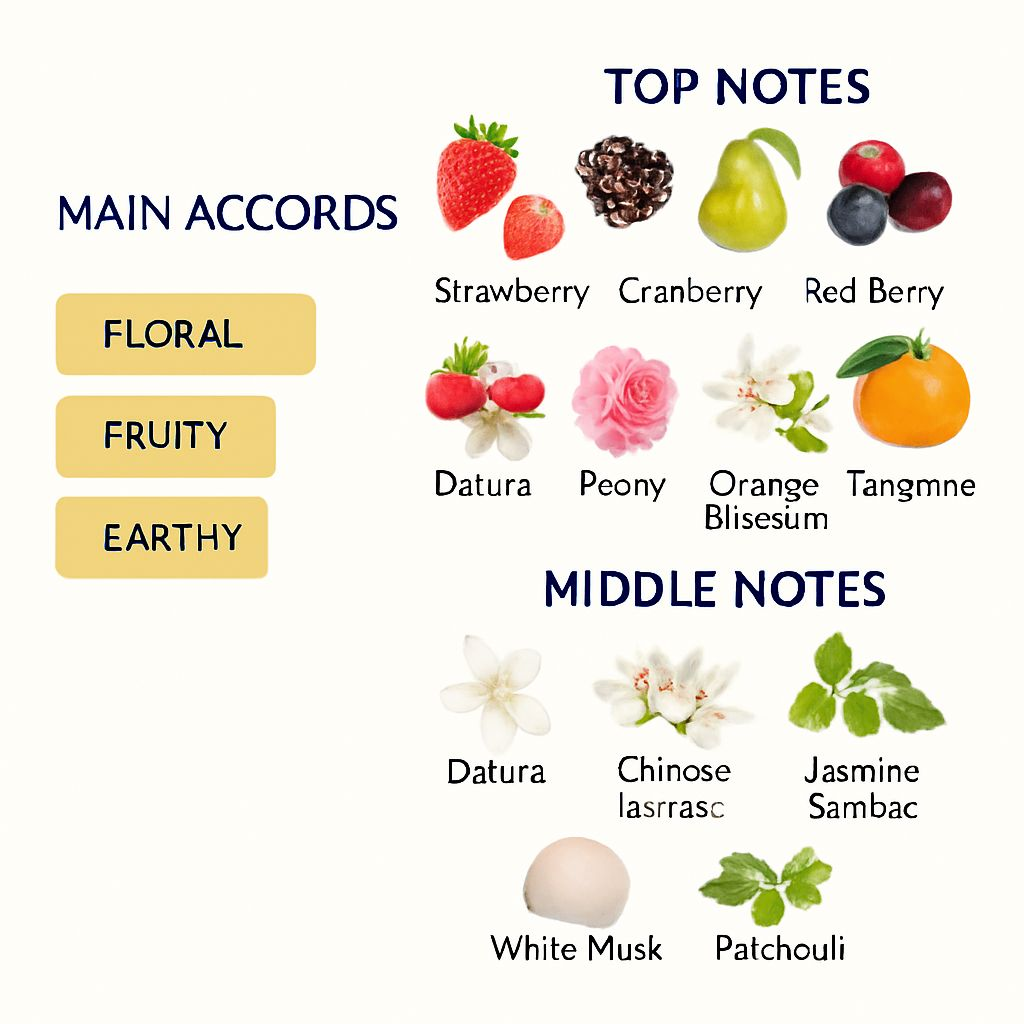 Top notes: strawberry, cranberry, blackberry, red berry, pear, calabrian bergamot, mandarin orange, and tangerine