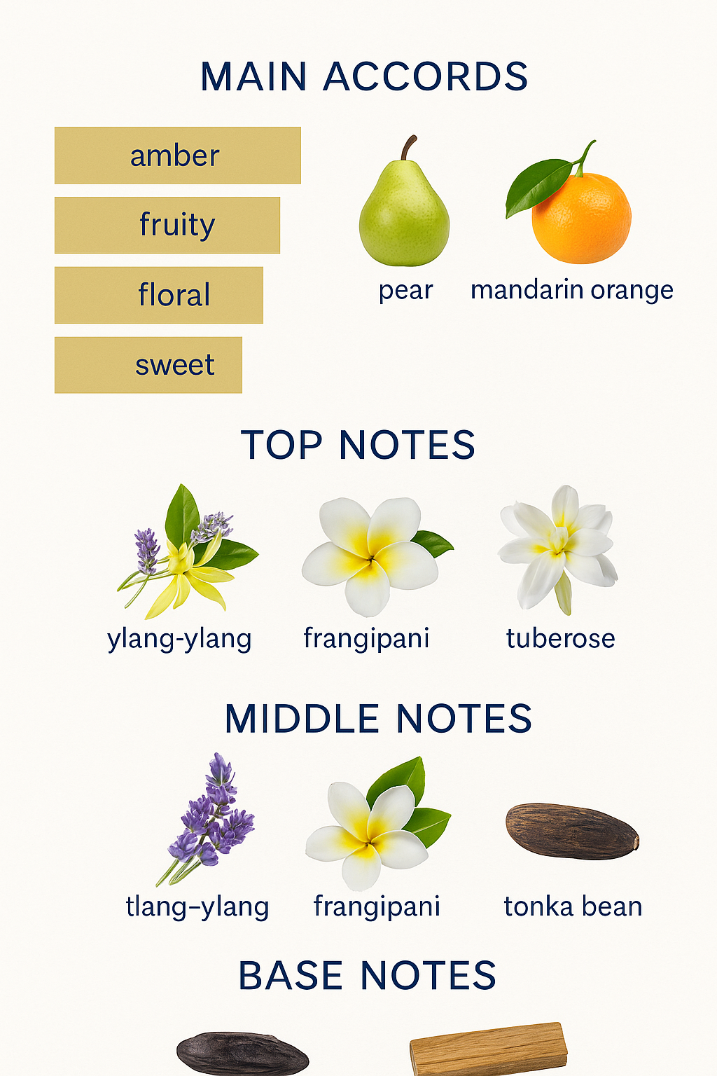 Heart notes: ylang-ylang, frangipani, and tuberose