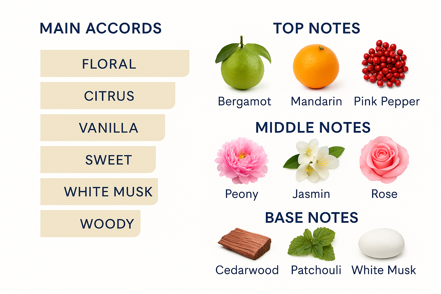 Top notes: The fragrance opens with a unique blend of bergamot, mandarin, and pink pepper, giving it a fresh and attractive start.