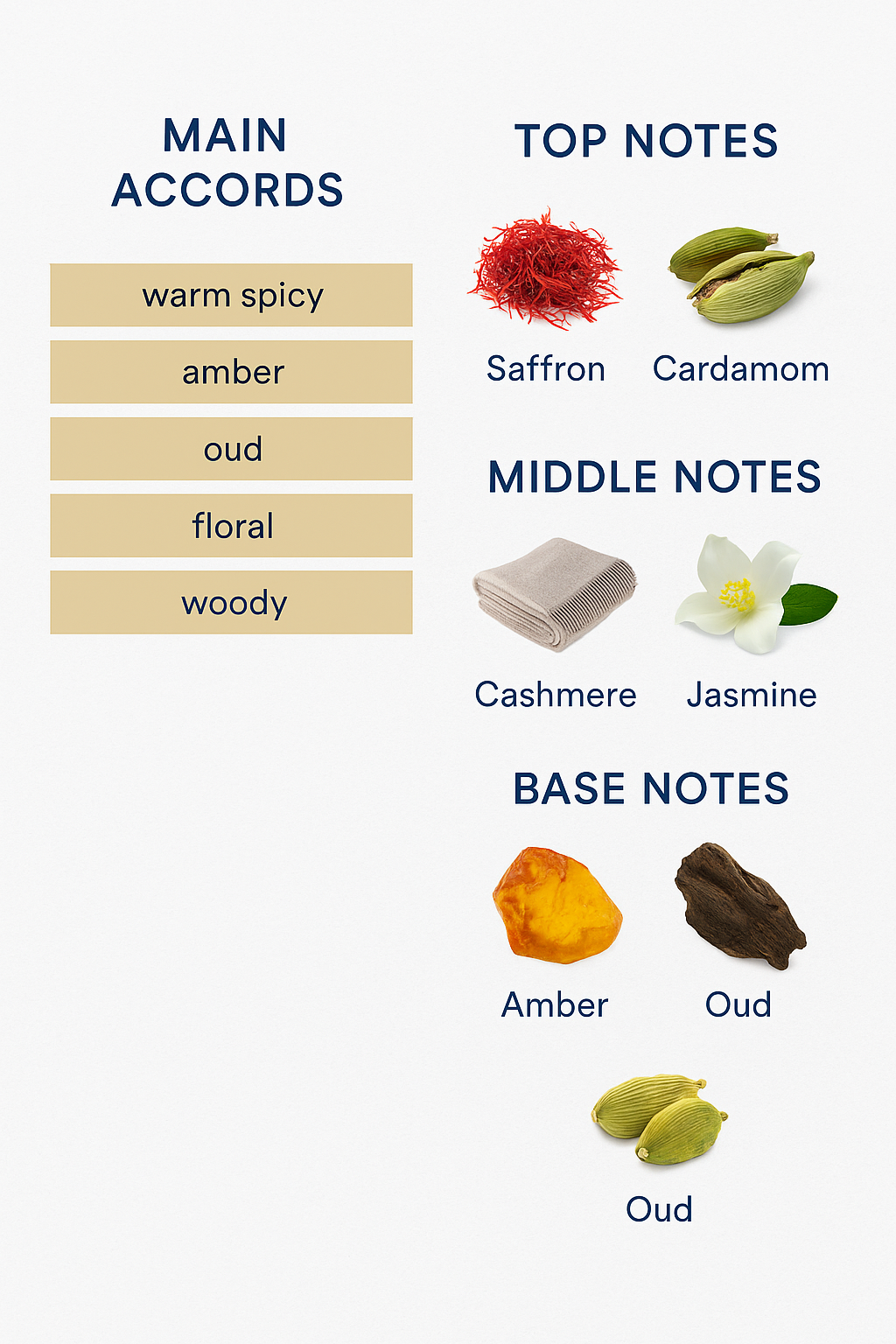 Top notes: The fragrance opens with a blend of saffron and cardamom, giving it a mysterious and attractive start.