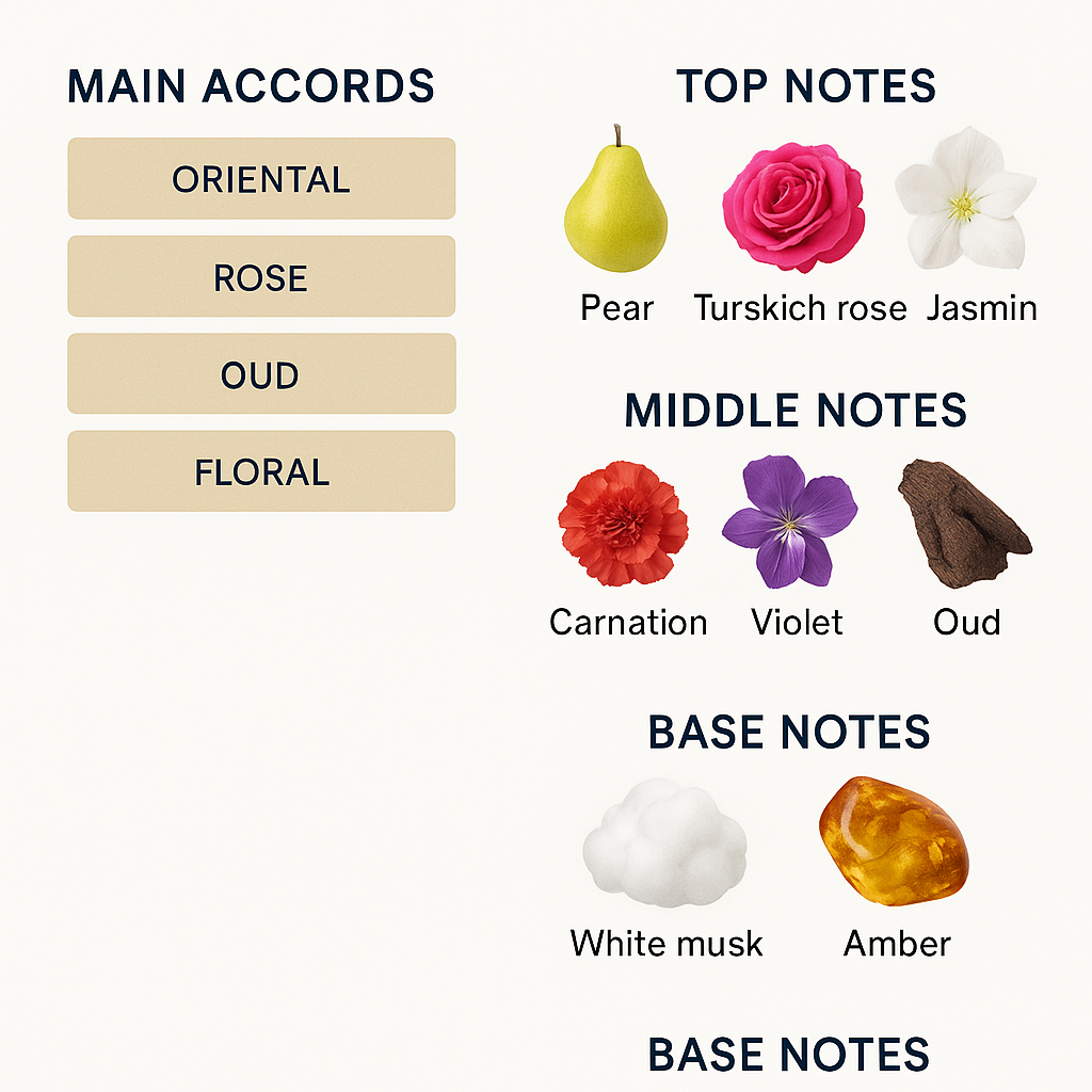 A unique fragrance: blending warm oriental notes and distinctive oud scents with a touch of fruit.